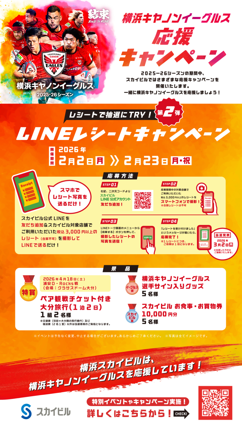 スカイビル公式LINEアカウントを友だち追加の上、スカイビル内対象店舗でご利用いただいた税込3,000円以上のレシート(合算不可)を撮影してご応募いただくと、抽選で「2026年4月18日(土) 浦安D-Rocks戦 ペア観戦チケット付き大分旅行(1泊2日)」や「選手サイン入りイーグルスグッズ」等が当たるキャンペーンを実施いたします。