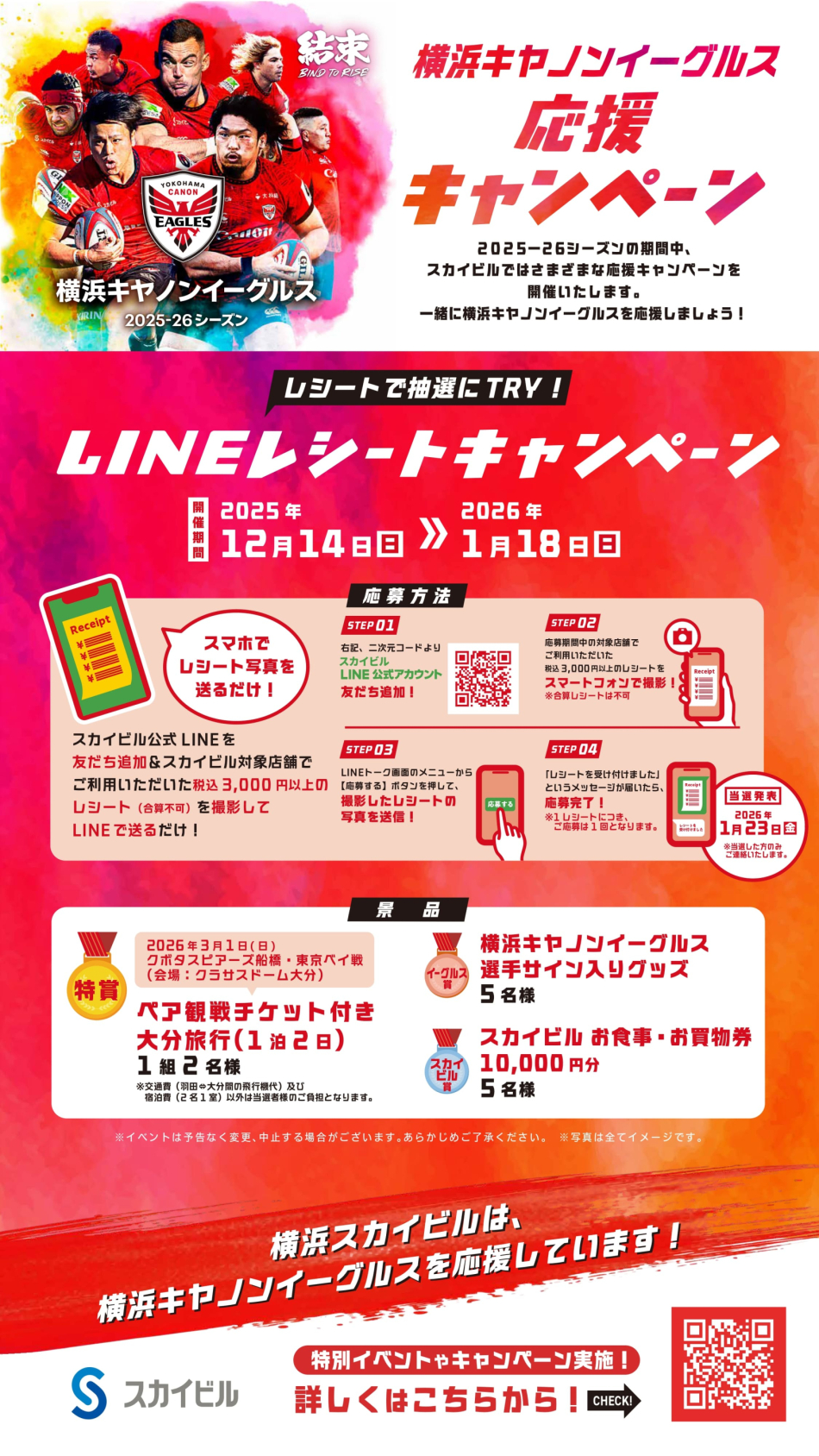 スカイビル公式LINEアカウントを友だち追加の上、スカイビル内対象店舗でご利用いただいた税込3,000円以上のレシート(合算不可)を撮影してご応募いただくと、抽選で「2026年3月1日(日)クボタスピアーズ船橋・東京ベイ戦 ペア観戦チケット付き大分旅行(1泊2日)」や「選手サイン入りイーグルスグッズ」等が当たるキャンペーンを実施いたします。