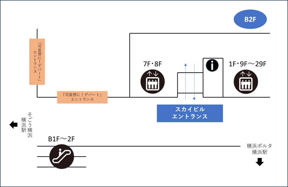 スカイビルB2Fエントランスを入って左側のエレベーターをご利用ください。